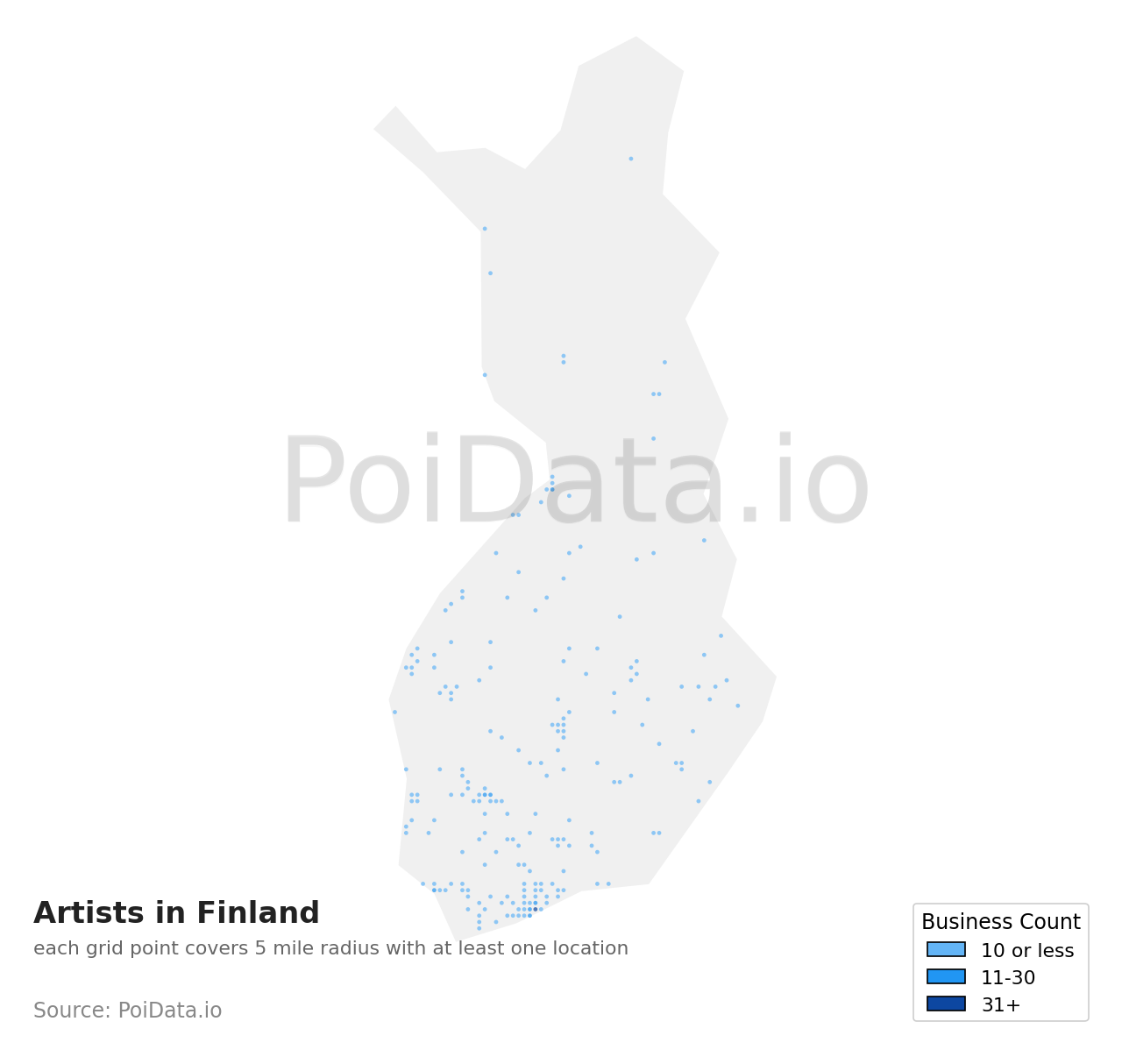 Perform advanced spatial analysis to identify business clusters, service gaps, and market saturation patterns across 0 states in Finland using precise coordinate data from 509 Artists.