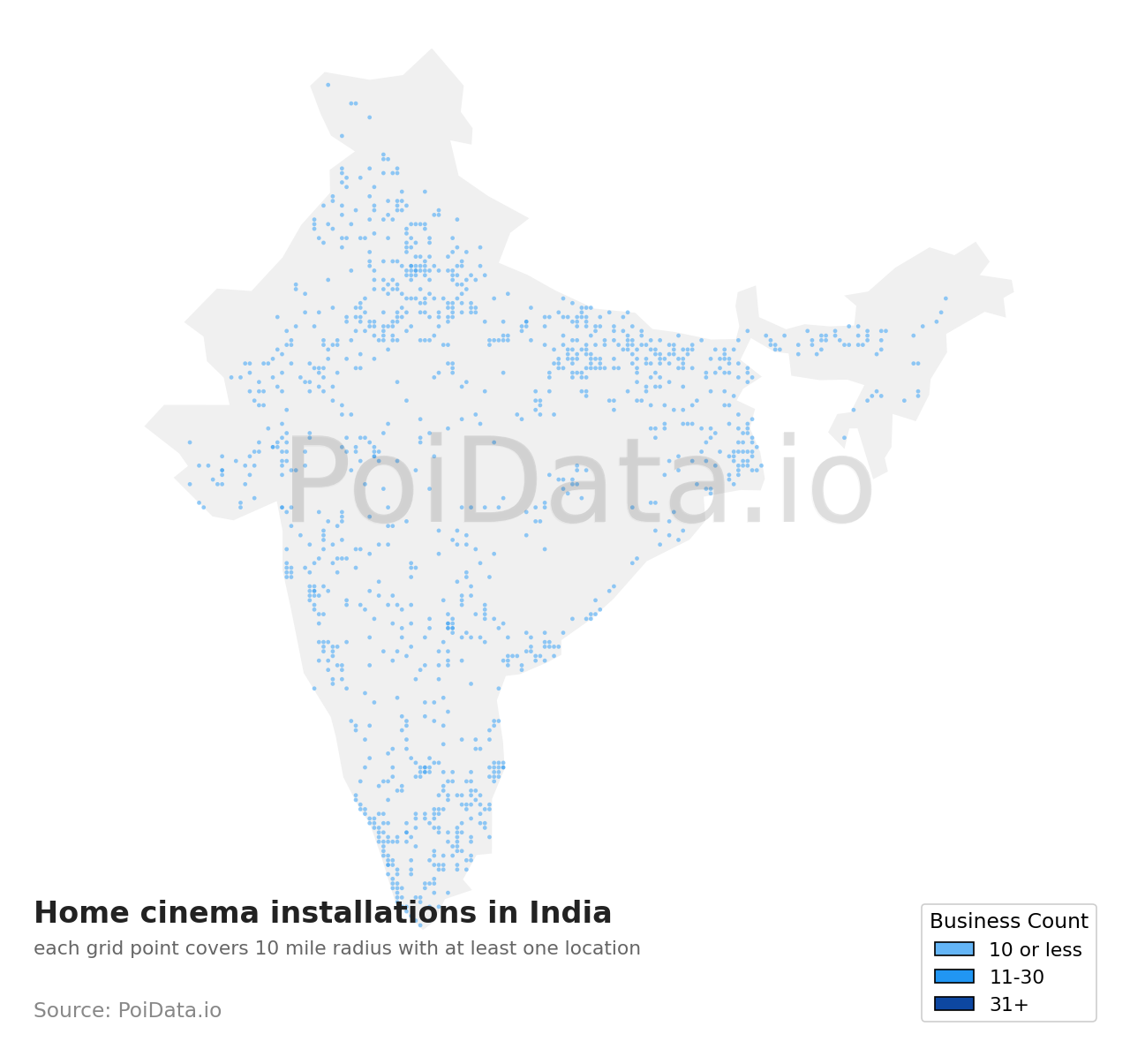 Add Home cinema installations POI data to your apps for delivery, logistics, or travel using accurate coordinates from 1,955 verified locations in India.